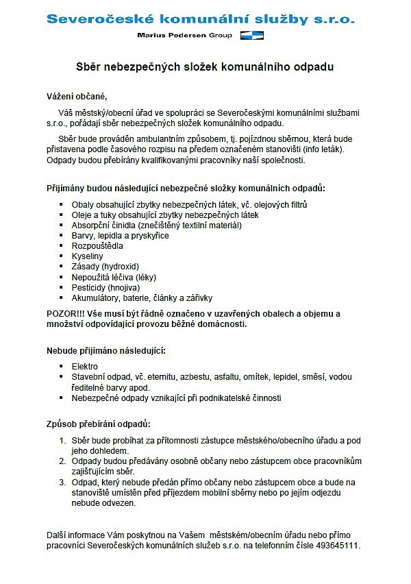 Oznamujeme, že v sobotu 22. listopadu 2025 bude v našich obcích probíhat svoz nebezpečných složek komunálního odpadu.